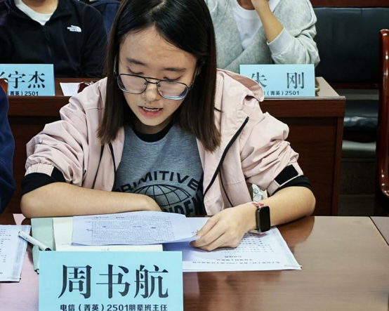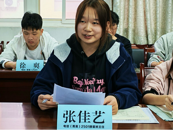 班委代表围绕“学涯规划与班团建设”展开交流。班长、团支书、学习委员等依次发言,内容涵盖新生适应、舍风建设、兴趣培养、集体荣誉感塑造、手机管理等现实议题,展现出新生代学子对自我成长与集体发展的深入思考,也彰显了班级骨干的服务意识与担当精神。 禁止复制
