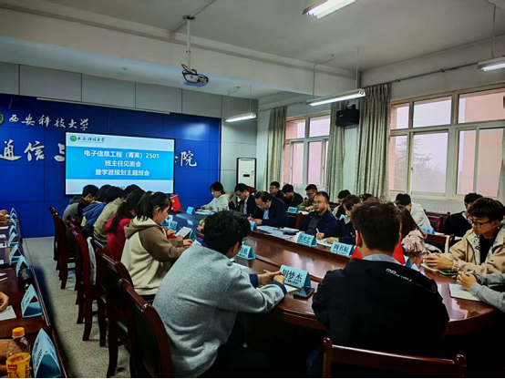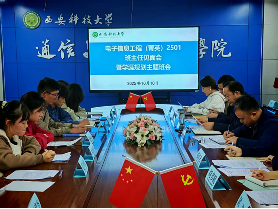2025年10月10日,西安科技大学通信学院电子信息工程(菁英)2501班班主任见面会暨学涯规划主题班会于临潼校区16-318会议室顺利举行。本次班会由2025级电子信息工程专业辅导员白冰洁主持,学院党委书记、电信(菁英)2501班班主任张剑,学院党委副书记张振中,电信系教师朱代先,朋辈班主任周书航、张佳艺以及菁英2501班全体同学共同参与,共话成长蓝图,共启卓越大学新程。 禁止复制